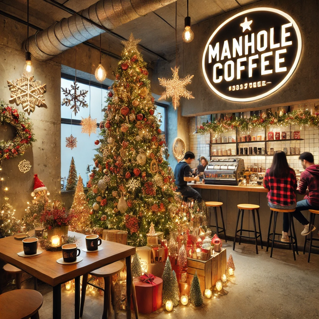 맨홀커피는 도심 속에서 따뜻한 크리스마스 분위기를 즐길 수 있는 아늑한 공간으로, 다양한 크리스마스 한정 메뉴와 인테리어로 방문객들에게 특별한 연말의 즐거움을 선사합니다.